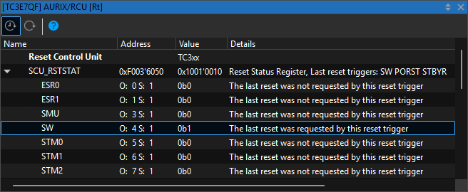 In this example, the last reset happened because of a software-triggered reset, which can help you pinpoint the exact function in your source code that is initiating it. As you can see, RSTSTAT.SW bit is set.