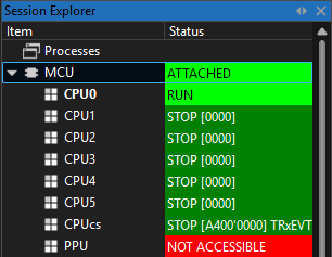 Below you can see the CPU Statuses in the Session Explorer window directly after reset in Foreground mode (CPU0 would be suspended with core synchronization enabled).